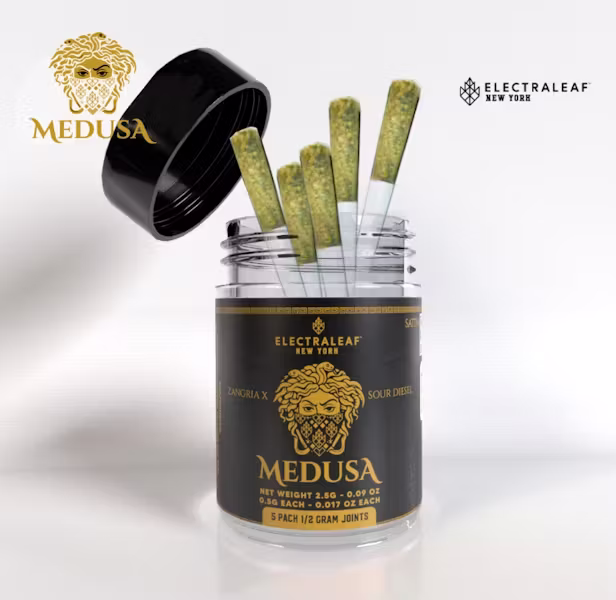 Shop Electraleaf Medusa 5-Pack Prerolls featuring Zangria x Sour Diesel genetics. Sweet berry flavor, gassy finish, and uplifting sativa effects with 26.59% THC.