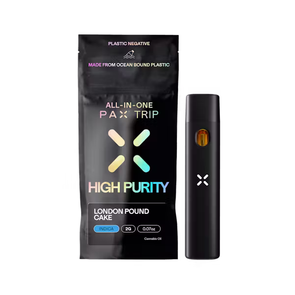 Experience deep relaxation with the PAX Trip London Pound Cake 2g All-In-One Vape. This indica delivers smooth vanilla, lemon, and sweet cake flavor with 78% THC in an eco-friendly AIO made from ocean-bound plastic. Perfect for stress relief, nighttime use, and dessert-flavor lovers